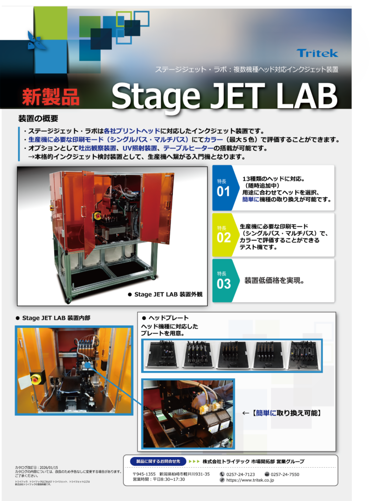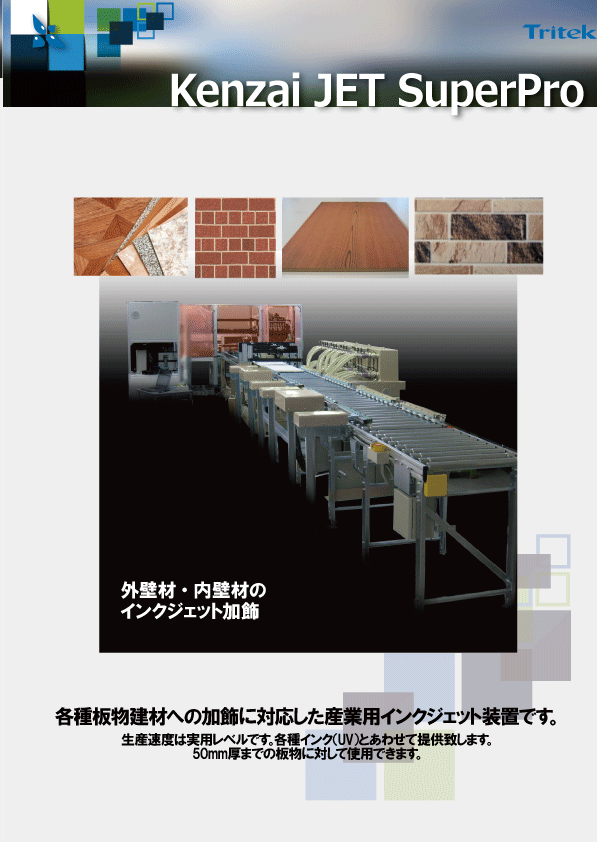 カタログ 製品カタログ トライテック装置のカタログです。画像をクリックしてPDFダウンロードできます。 Stage JET Dual(JP) Stage JET EM-1(JP) Stage JET IT-1(JP) Stage JET(JP) Roll JET FP(JP) Roll JET(JP) EB SR-1 OnePass JET EB(JP) OnePass JET(JP) Cylinder JET Series(JP) Kenzai JET(JP) Kenzai JET Pro(JP) Kenzai JET-Edge(JP) Wi-For JET(JP) Patterning JET(JP) PJ-PE(JP) PrintStation(JP) MarkStation(JP) DotView(JP) カタログ